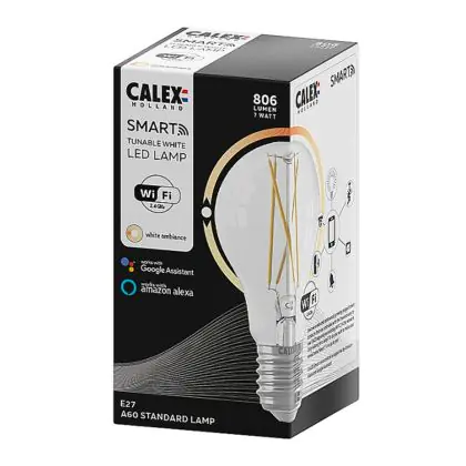 Ben je op zoek naar slimme E27 LED verlichting van topkwaliteit? Dan maak je met deze E27 Calex Smart LED Lamp een uitstekende keuze! Deze Calex Smart lamp heeft de welbekende E27 schroeffitting en gekleurde heldere glas, waardoor je het LED Filament (kooldraad) goed zit! Qua vermogen verbruikt deze Smart verlichting slechts 7 Watt. Daardoor ga je fors besparen op je energiekosten, want deze slimme LED verlichting is de energiezuinige vervanger van conventionele E27 gloeilampen. Verder gaat deze Calex E27 LED verlichting 15.000 branduren mee en krijg je bij aankoop 2 jaar Lampdirect all-in garantie. Daarnaast draag je een steentje bij aan een schonere wereld, wanneer je kiest voor LED.