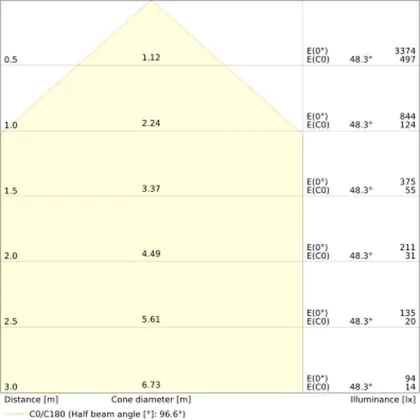 De gradenbundel geeft informatie over hoe breed het licht wordt uitgestraald. Dit zit tussen de 0 en 360 graden (D). Hoe kleiner de hoek, hoe specifieker de lichtbundel is. Over het algemeen is een smalle gradenbundel perfect voor sfeer- of accentverlichting, terwijl een brede gradenbundel ideaal is om grote oppervlaktes te verlichten.