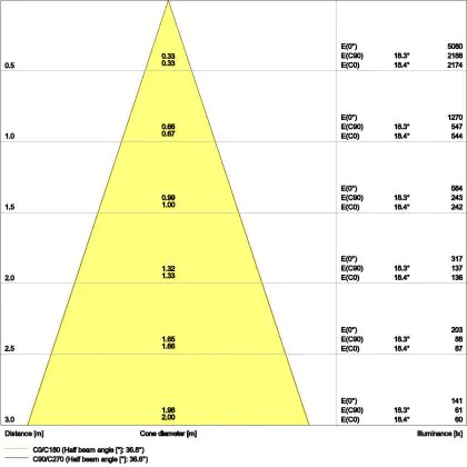 De lichtopbrengst en de gradenbundel spelen een grote rol. Zo geeft de lichtopbrengst van 720 Lumen in combinatie met de 36° stralingshoek deze inbouwspot een specifieke toepassing. Kort samengevat is een lichtintensiteit van maximaal 400 Lumen ideaal voor accentverlichting, terwijl hogere waardes goed gebruikt kunnen worden als basisverlichting. Over het algemeen geldt: hoe breder de gradenbundel, hoe geschikter deze is door basisverlichting. Dit komt doordat het licht over een groter oppervlak wordt verspreid. Smallere gradenbundels (tot 40°) kunnen echter bij hoge plafonds ook goed tot hun recht komen als algemene verlichting.